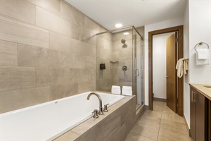 The Master bedroom offers a King size bed, flat screen TV & access to the balcony. With an attached Master bathroom with oversize soaking tub, double vanity, rain head shower and all top-of-the-line toiletries.