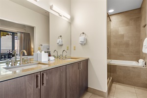 • Master Bedroom: King bed, private bath with soaking tub, walk-in shower, double vanity and patio access