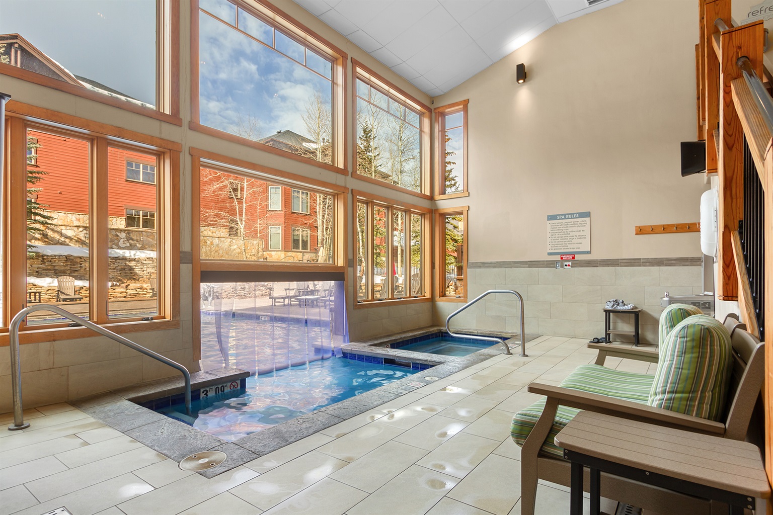 * Indoor/Outdoor hot tubs and heated all-season pools, locker rooms with showers and changing facilities, plenty of sunning decks with lounge chairs.