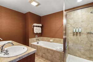 • Master Bedroom with a king-size bed and ensuite bathroom featuring a jetted spa tub, separate walk-in shower, and double vanity